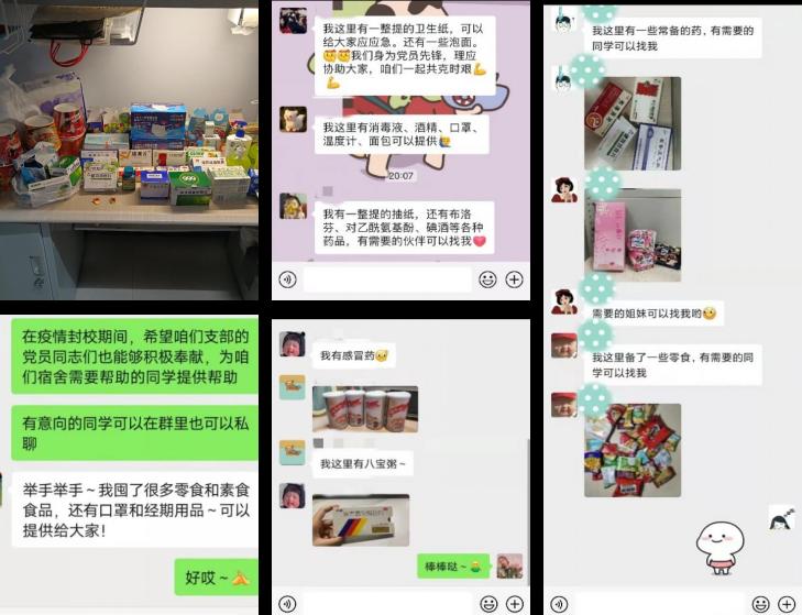 一百余名学生的教育管理和服务保障工作以及四公寓楼内四百余名学生的思想政治工作。3月17日下午,临时党支部刚一成立,孙佳钰老师立刻带领支部党员同志召开了第一次线上支部会,会议讨论的第一件事就是如何充分发挥党员的先锋模范带头作用,团结一心,共克时艰。在分配和落实好宿舍楼内日常疫情防控工作之外,支部成员们积极讨论在封闭校园管理期间还能为其他同学做点什么,如何更好地解决同学们的生活所需。支部决定在四公寓楼的611室设立“爱心自助屋”,让同学们可以足不出户地共享生活必需品,并安排专人定期对自助屋内进行消毒。支部的二十余名党员首当其冲,积极响应,把自己寝室里的食物、常见药品、生活物品等放到这里。爱心自助屋内现有常用药品十余盒,各类食品二十余种,防疫物资包括口罩、消毒湿巾、洗手液等十余件。很多同学都在自助屋内找到了自己急需的物品,还有很多同学没有选择去拿,而是选择奉献爱心,把自己的物品放了上去,让这里成为了一个接受爱心、奉献爱心、传递爱心的中转站。