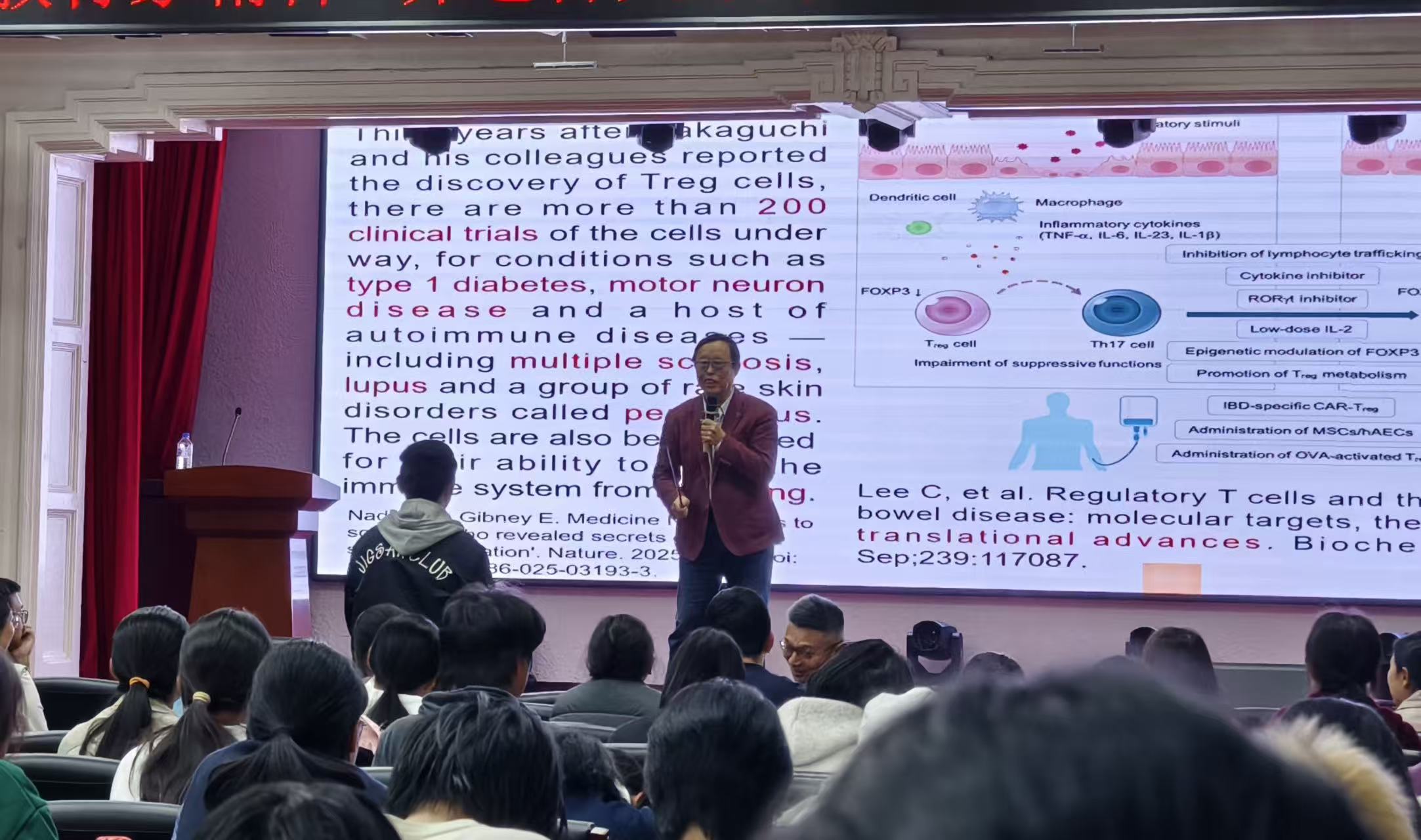 2025年诺贝尔生理学或医学奖授予了三位科学家,以表彰其“在外周免疫耐受方面的发现”。于永利教授结合诺奖最新成果,以“油门与闸”“正能量与负能量”等贴切生活的比喻揭示了免疫系统的调控机制。他指出,免疫系统中的辅助性T细胞与细胞毒性T细胞就好比“油门”,能积极推动免疫反应、清除病原体或杀伤肿瘤细胞。然而“油门”过强时,免疫系统可能误伤自身组织,引发一系列的自身免疫疾病。正因如此,科学家们意识到免疫系统中一定还存在一种机制,能像“闸门”一样防止过度反应。“我们需要一个制动系统”于永利教授这样总结道,“让免疫反应在保护身体的同时,学会‘适可而止’。”带着这种思考,科学家们踏上了寻找免疫系统“闸门”的科研之路,这也成为调节性T细胞(Treg)发现的开端。