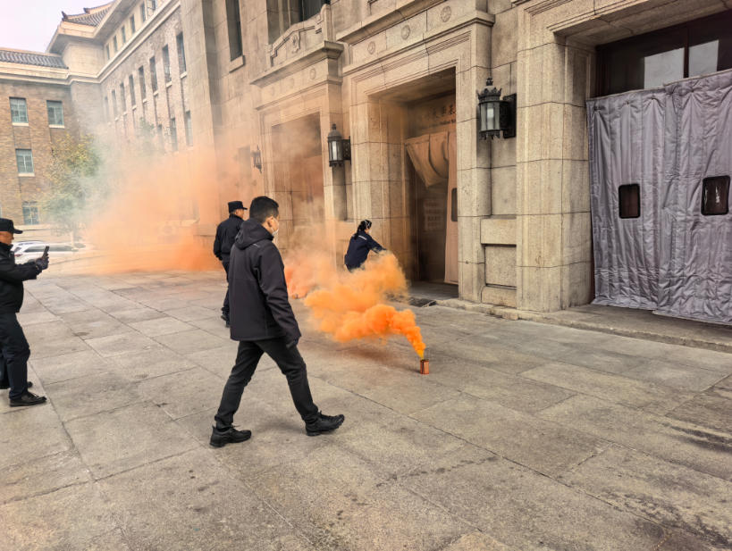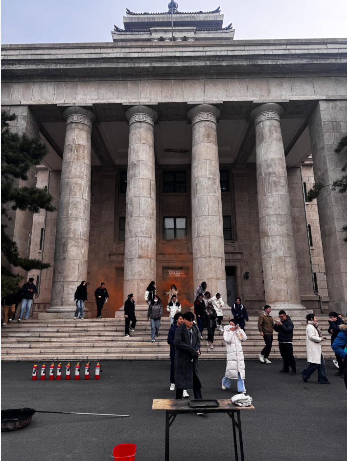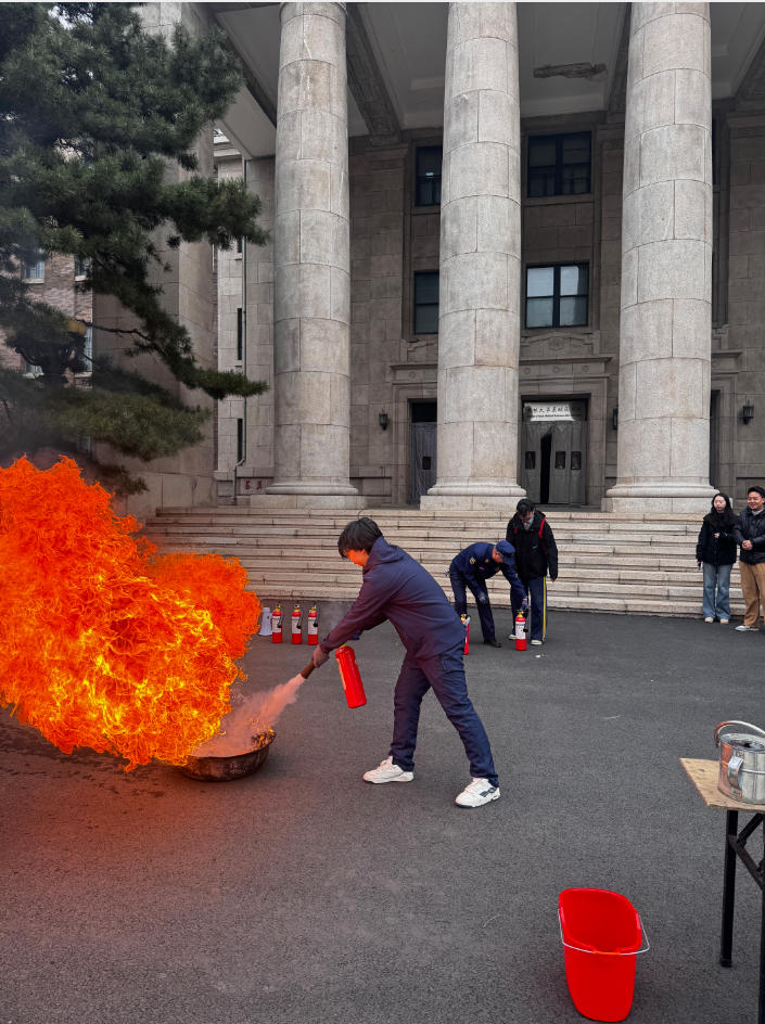 组成由通讯组、疏散组、灭火组、医疗组、保障组组成的演练消防队,随着模拟浓烟升起,消防队帮助师生熟悉疏散逃生路线、掌握疏散逃生技能。大家手捂口鼻、弯下腰迅速有序地从指定楼梯和安全出口逃生,撤离到楼外的安全地带。随后,新民校区保卫处安志成老师详细演示了灭火毯、灭火器的用法,并指导老师和同学亲身体验,现场使用灭火毯、灭火器扑灭初期火灾,提升了突发情况的应急处置能力。