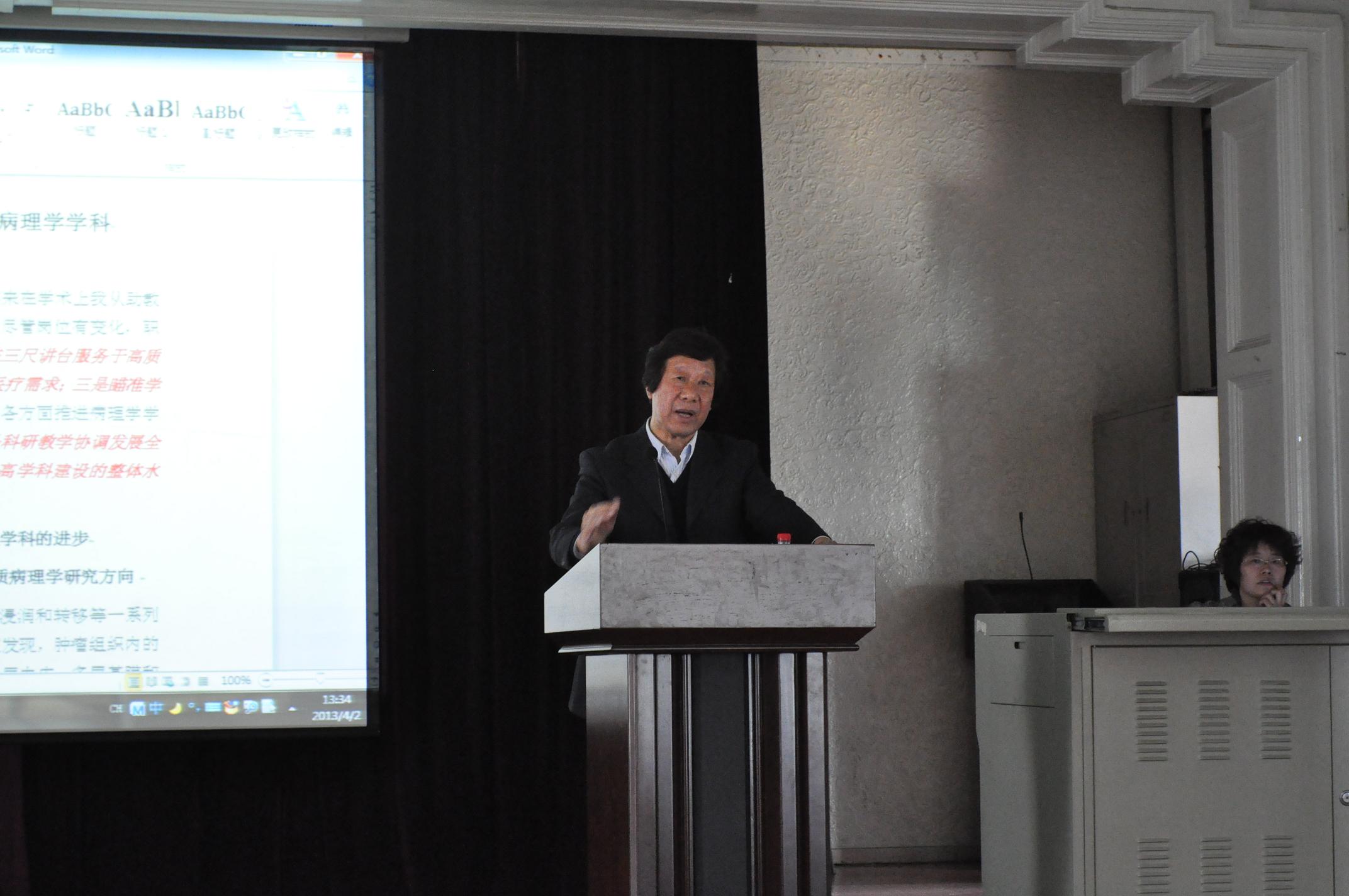 在报告中,原吉林大学常务副校长、 博士生导师李玉林教授结合自己40年的工作经历,以“瞄准学术发展前沿,创建一流病理学科”为题,回顾并总结了如何在实际的科研工作中,结合国际学术发展的动态,大胆开启肿瘤间质病理学研究方向,发现肿瘤微循环的机能反应规律,并开创恶性肿瘤升压化学药物疗法的历程;介绍了通过获取毛囊间充质干细胞,完成毛囊间充质干细胞组织工程构建的技术突破,进而促进我国再生医学研究的价值;以及以高水平的科学研究推动高水平人才培养的学科发展模式。李玉林教授最后以“做人要知足,做事要不知足,做学问要知不足”与全院师生共勉。