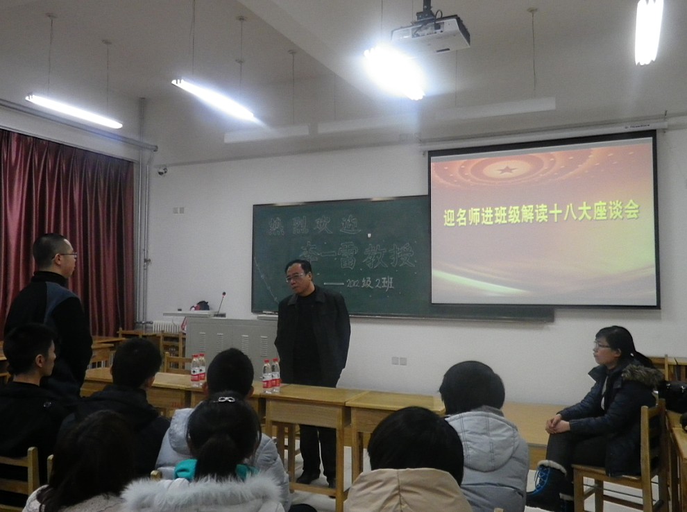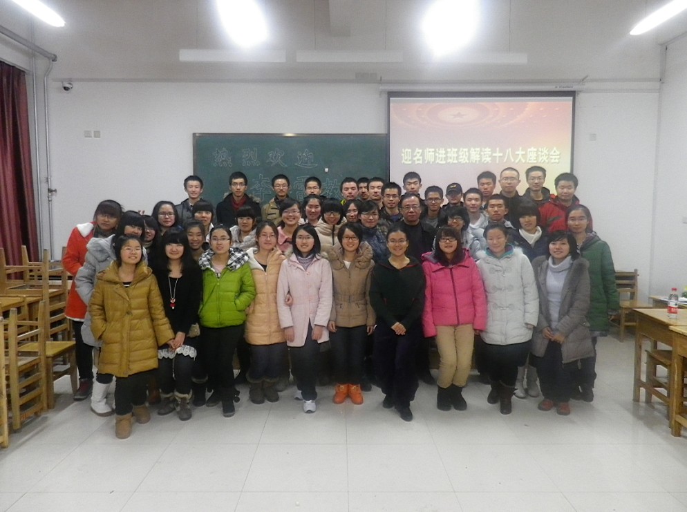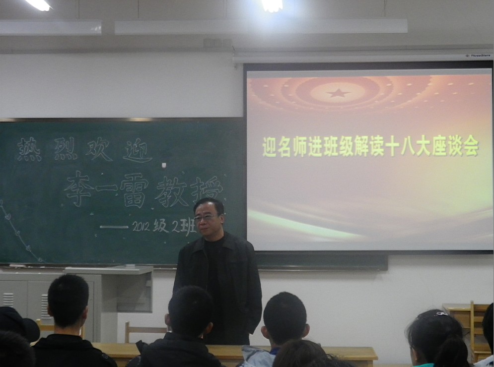 副院长、病理学系教授、701202班名师班主任李一雷与所带班级全体同学在中心校区李四光教学楼114教室开展“解读十八大精神,青春与祖国同行”主题班会。