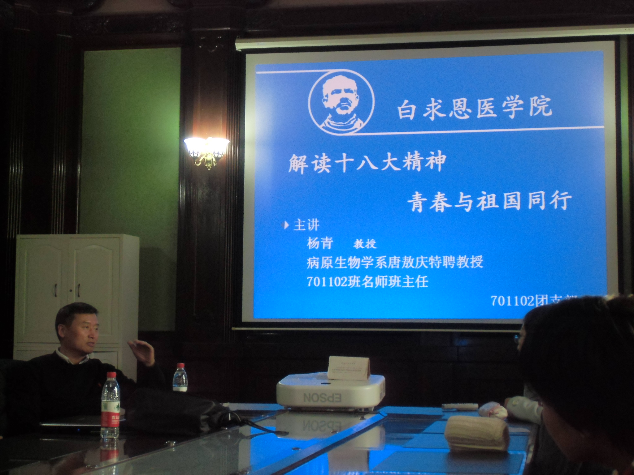 11月25日下午,白求恩医葡京娱乐城 病原生物学系唐敖庆特聘教授杨青在新民校区基础楼四楼会议室与所带班级701102班全体同学召开主题班会。