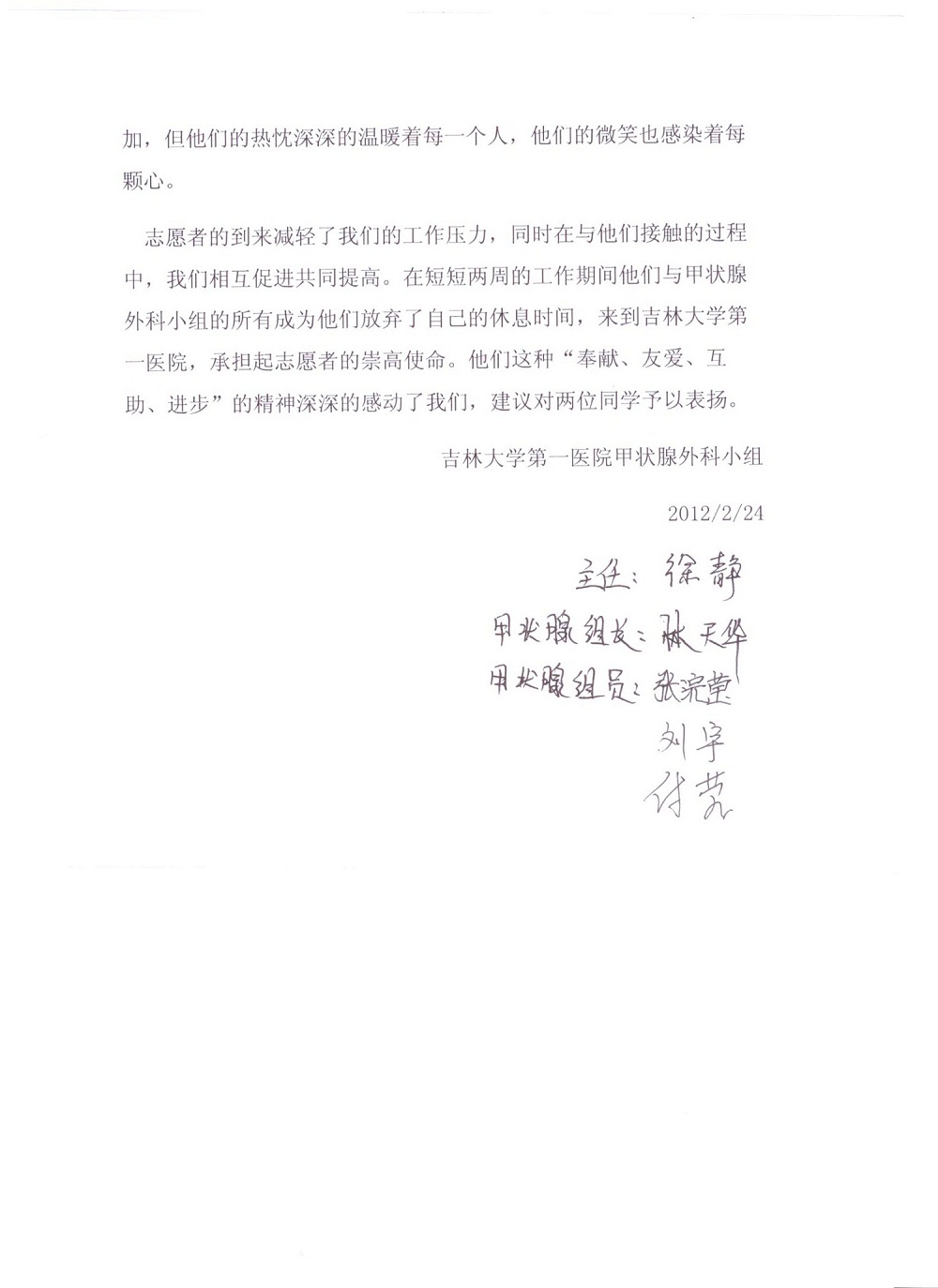 近日,白求恩医葡京娱乐城 团委收到吉林大学第一医院甲状腺外科小组寄来的表扬信。对葡京娱乐城 志愿者团队为吉林大学第一医院所做的志愿服务工作表示感谢,尤其是感谢701101班的刘菲琳同学和701002班的陈雪东同学,他们在寒假志愿者服务活动中协助科室护士为来甲状腺外科就诊的患者提供帮助、奉献爱心,以“无私奉献”的志愿者精神为患者带去了温暖。