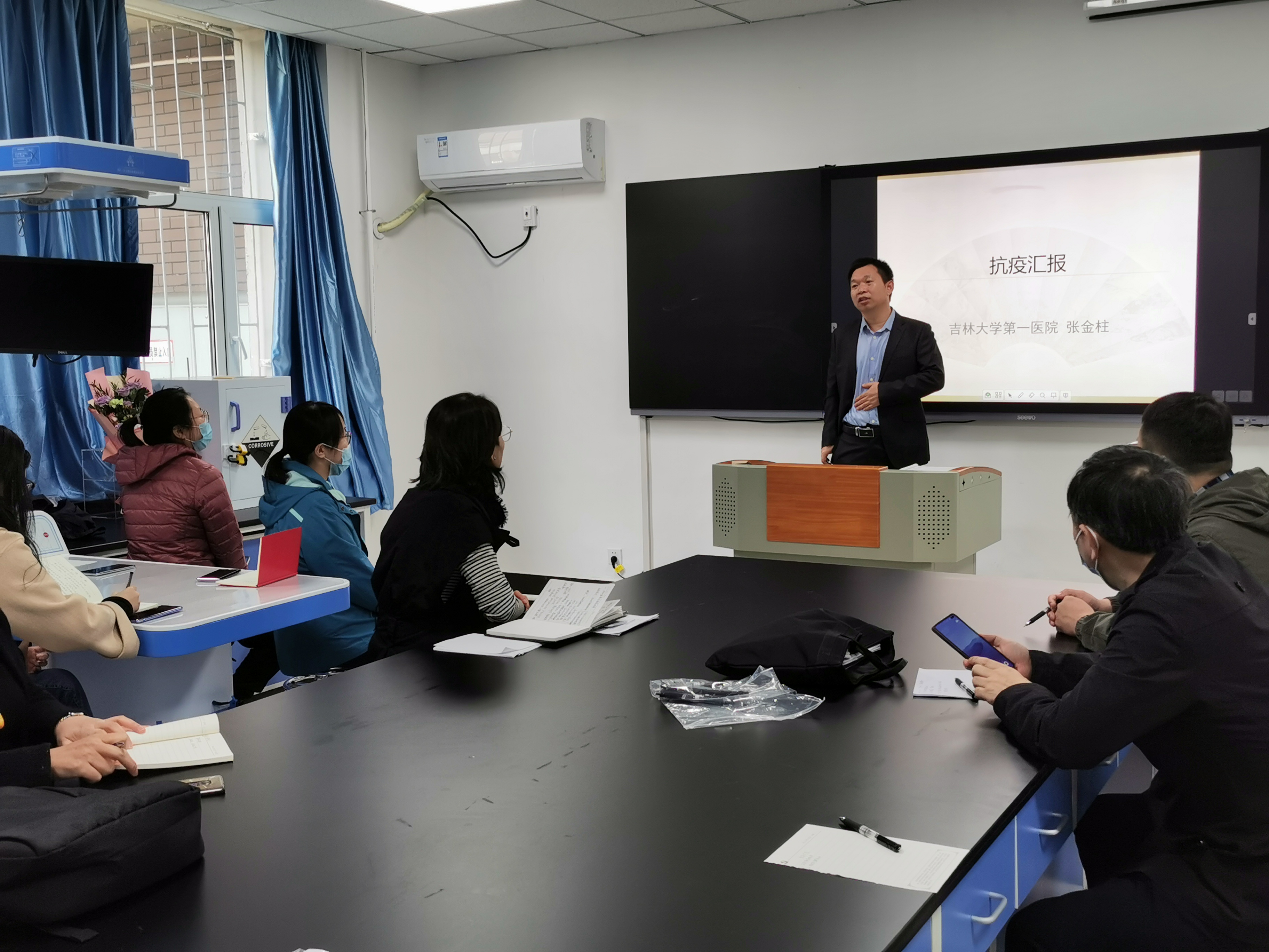 本次活动邀请到参加通化抗疫的一线医生,吉林大学第一医院神经血管外科重症监护室张金柱老师讲座。张金柱老师在重症监护室工作10余年,对重症患者的救治非常有工作经验和独特见解,在2021年初主动请缨同吉大一院抗疫医疗队到通化抗疫第一线参加重症患者的救治工作。张老师从“政府不容易、人民不易和医务工作者不易”三个方面进行讲述,从学术专业角度讲述了新冠病毒的流行病学特点、临床表现、治疗及预防等,也说出了参加抗疫前后以及凯旋归来的所思、所想和所感,朴实的话语却感人至深,真正体现了一名普通的医务工作者“不畏艰苦、甘于奉献、救死扶伤、大爱无疆”精神面貌。随后,药理学系的靳英丽和关凤英两位老师与张老师进行了深入交流。