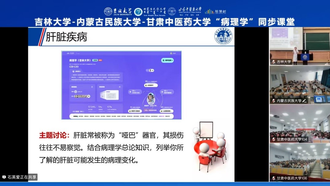 与内蒙古民族大学、甘肃中医药大学三校云端聚首,依托 “智慧树” 在线教育平台,成功开展了《病理学》同步课堂活动。这是继《病理学AI课程》新形态教研西行(二期)项目后,三校在医学教育领域的又一次深度融合实践。